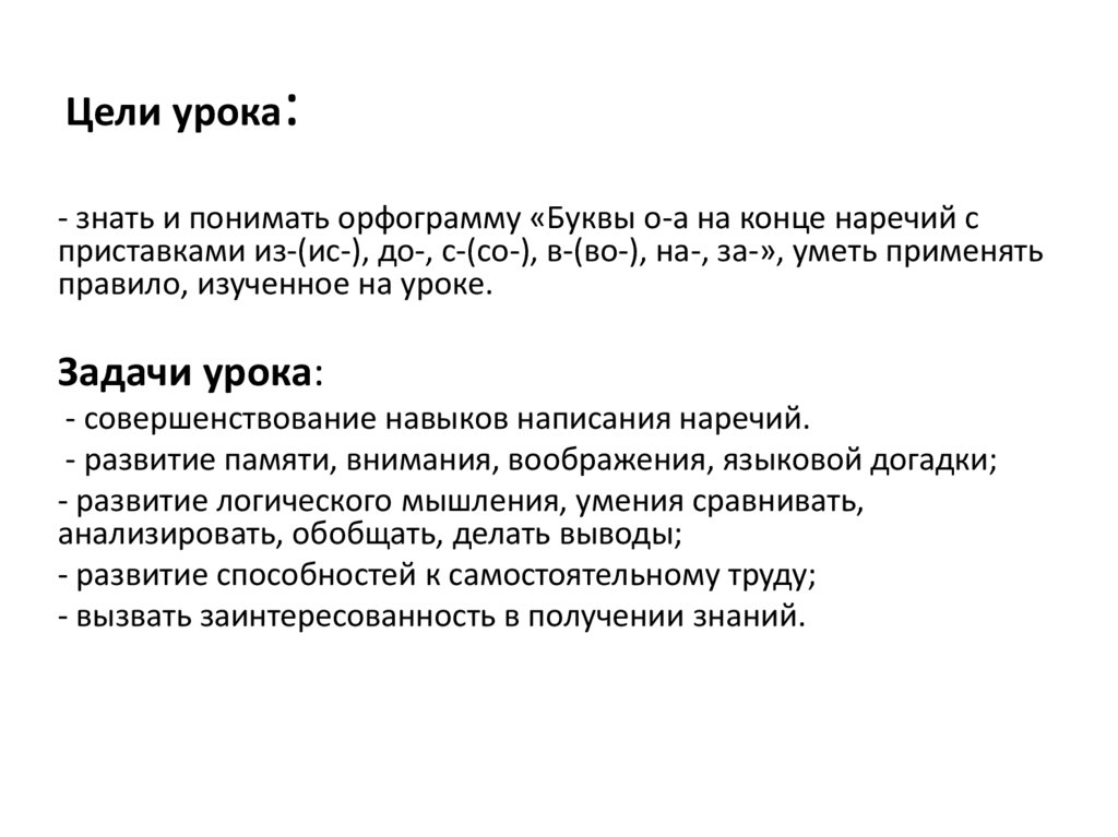 Цели урока:- знать и понимать орфограмму «Буквы о-а на конце наречий с