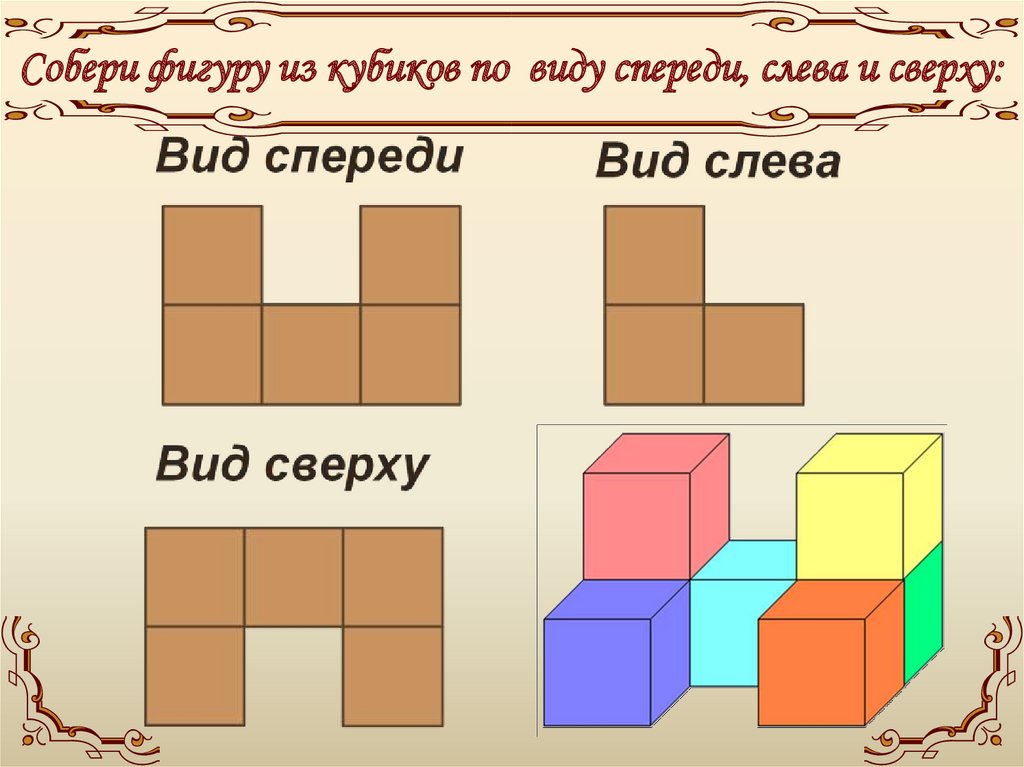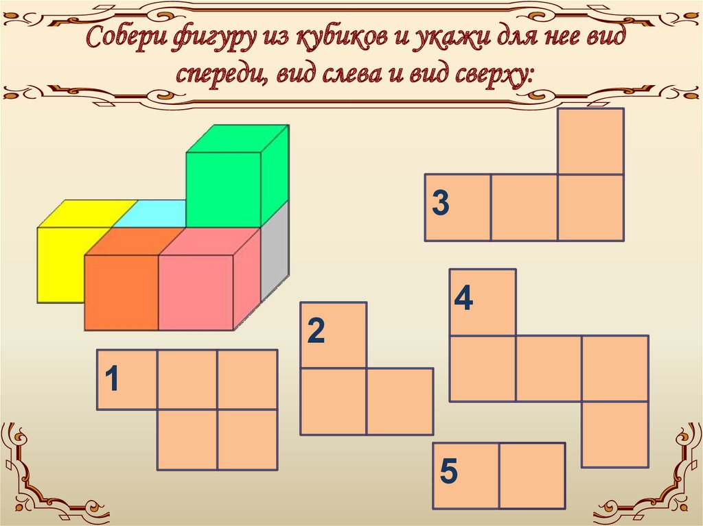 Собери фигуру из кубиков и укажи для нее видспереди, вид слева и вид сверху: