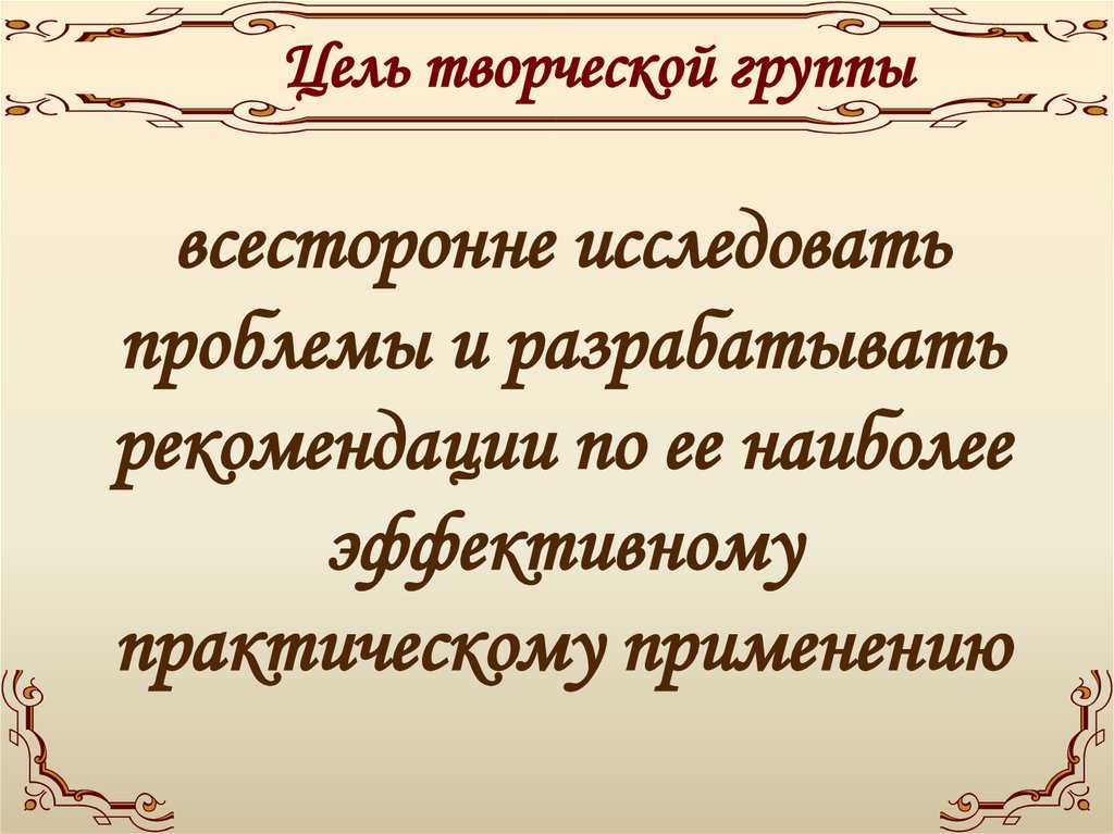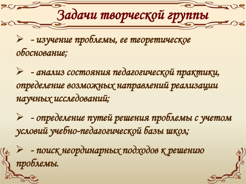 Задачи творческой группы- изучение проблемы, ее теоретическое