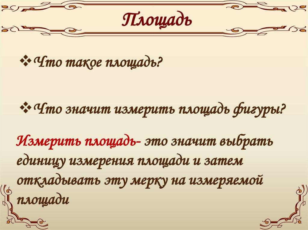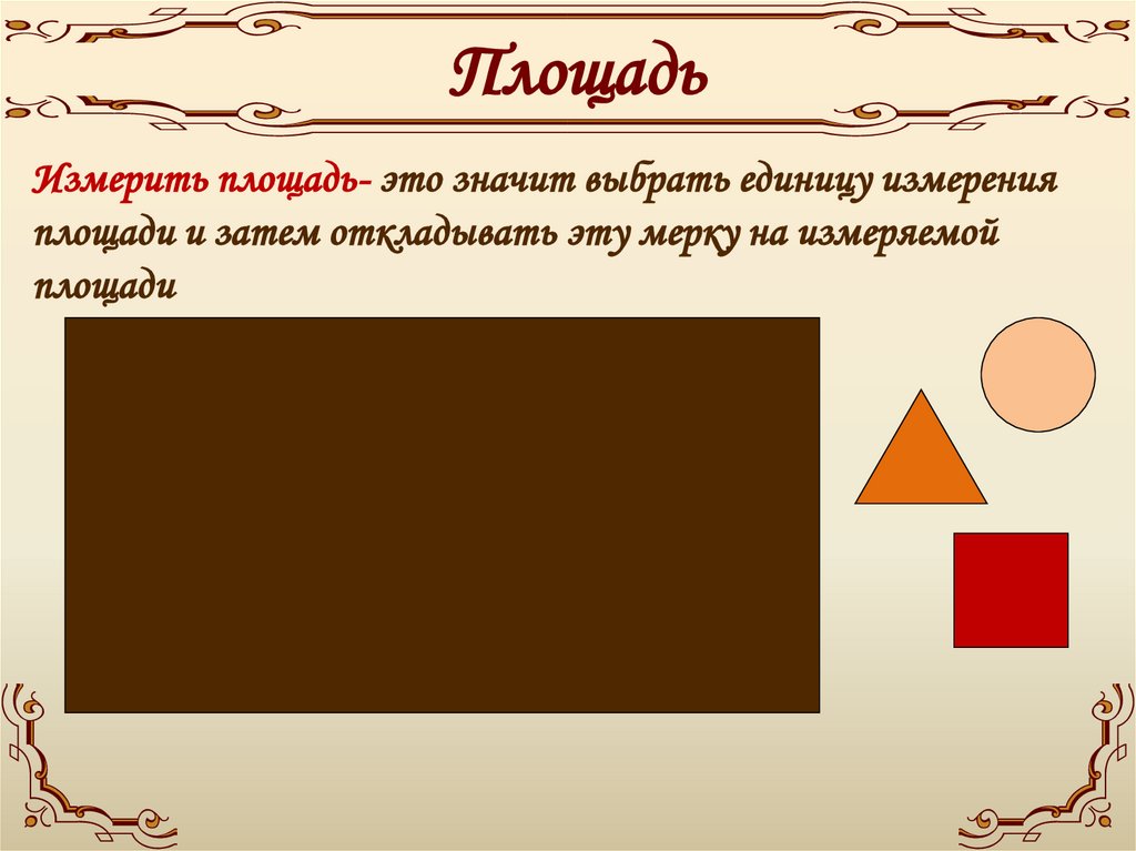 ПлощадьИзмерить площадь- это значит выбрать единицу измерения