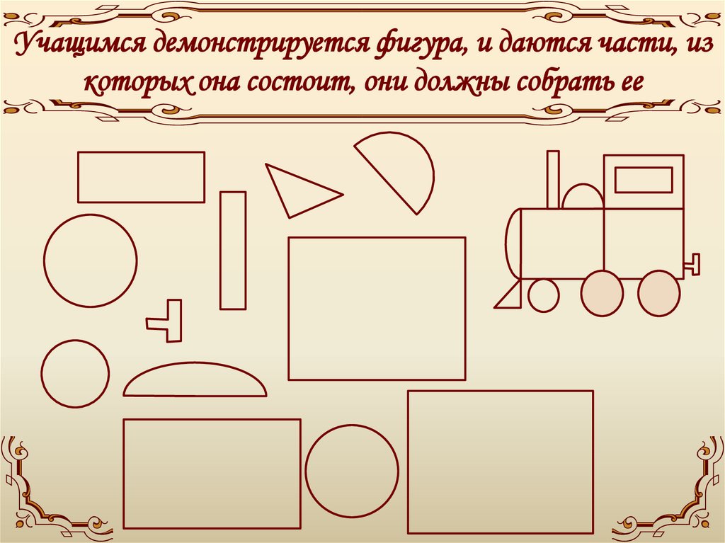 Учащимся демонстрируется фигура, и даются части, изкоторых она состоит, они должны собрать ее