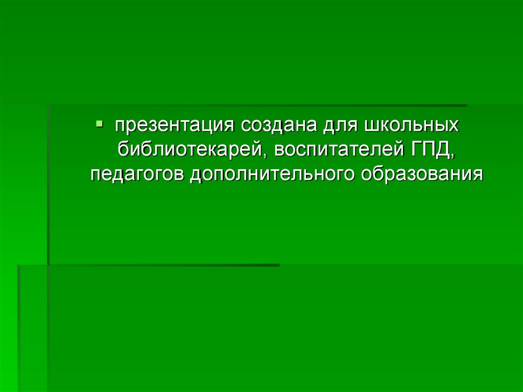 презентация создана для школьныхбиблиотекарей, воспитателей ГПД,
