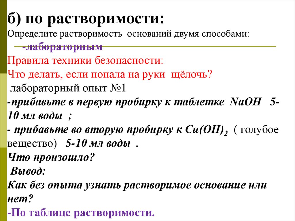 б) по растворимости:Определите растворимость оснований двумя способами: