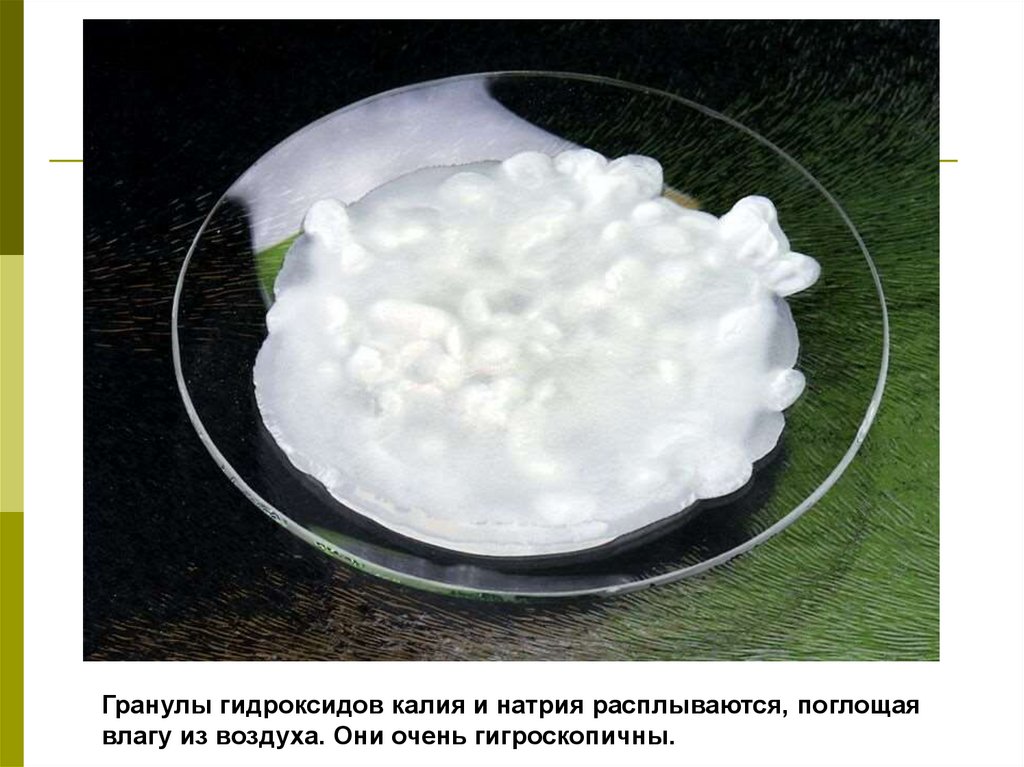 Гранулы гидроксидов калия и натрия расплываются, поглощаявлагу из воздуха. Они очень гигроскопичны.