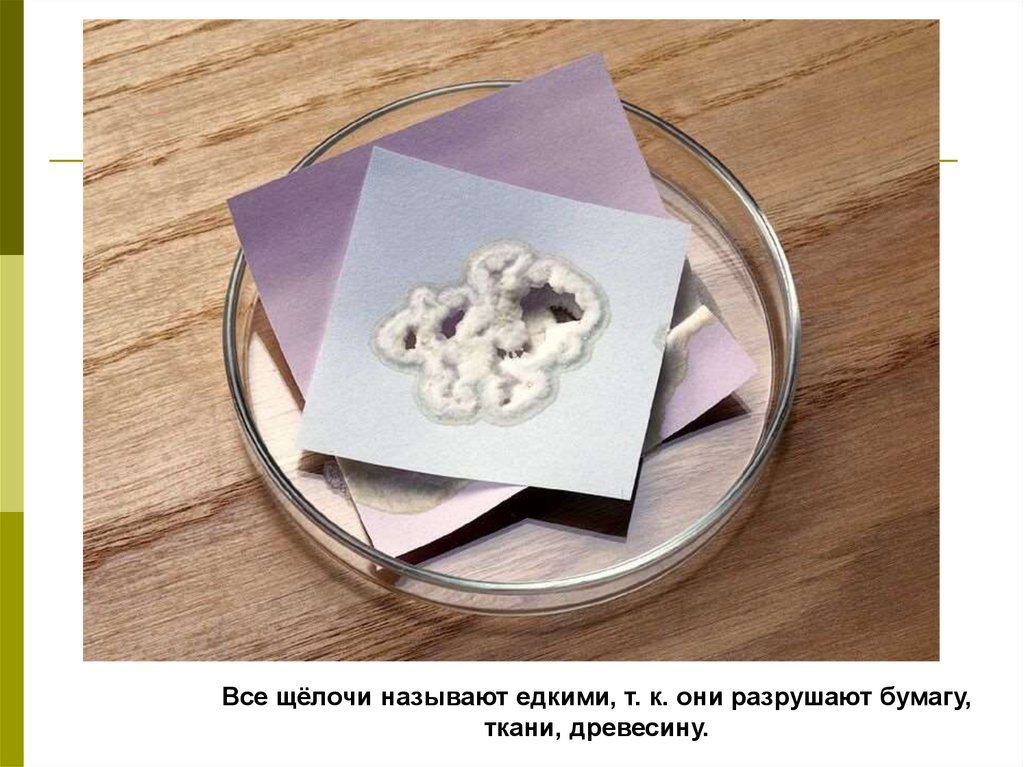 Все щёлочи называют едкими, т. к. они разрушают бумагу,ткани, древесину.