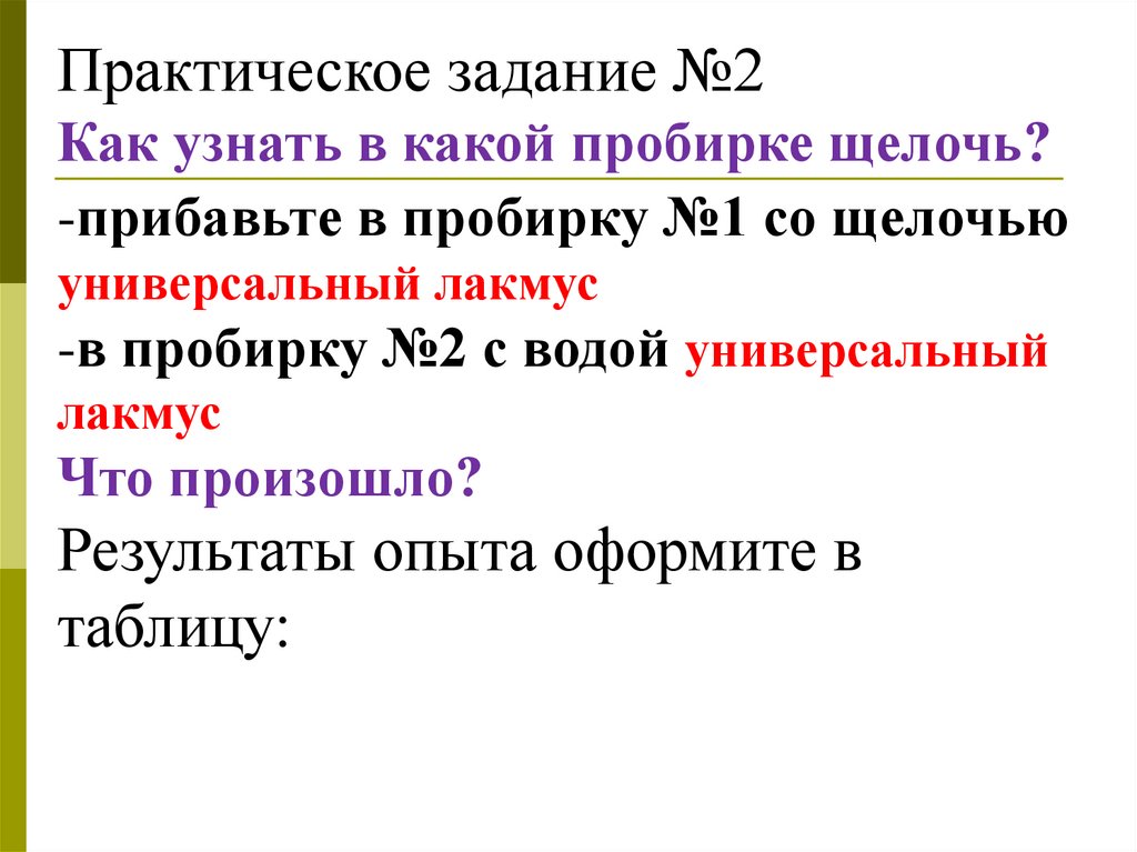 Практическое задание №2Как узнать в какой пробирке щелочь?