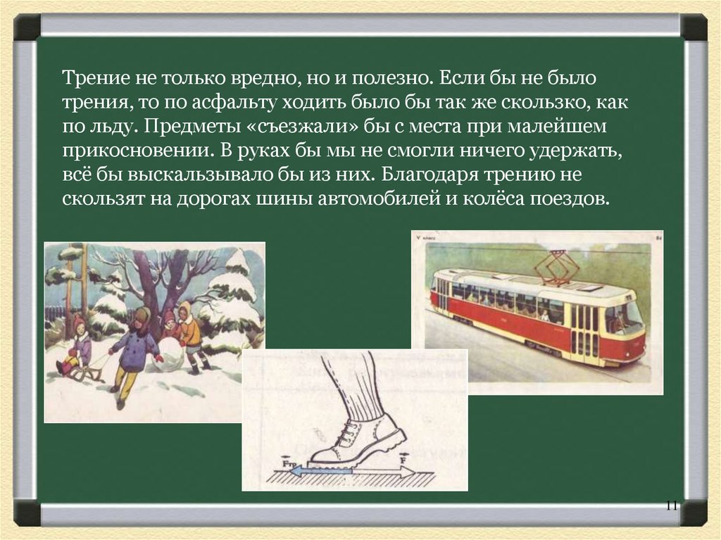 Трение не только вредно, но и полезно. Если бы не былотрения, то по асфальту ходить было бы так же скользко, как