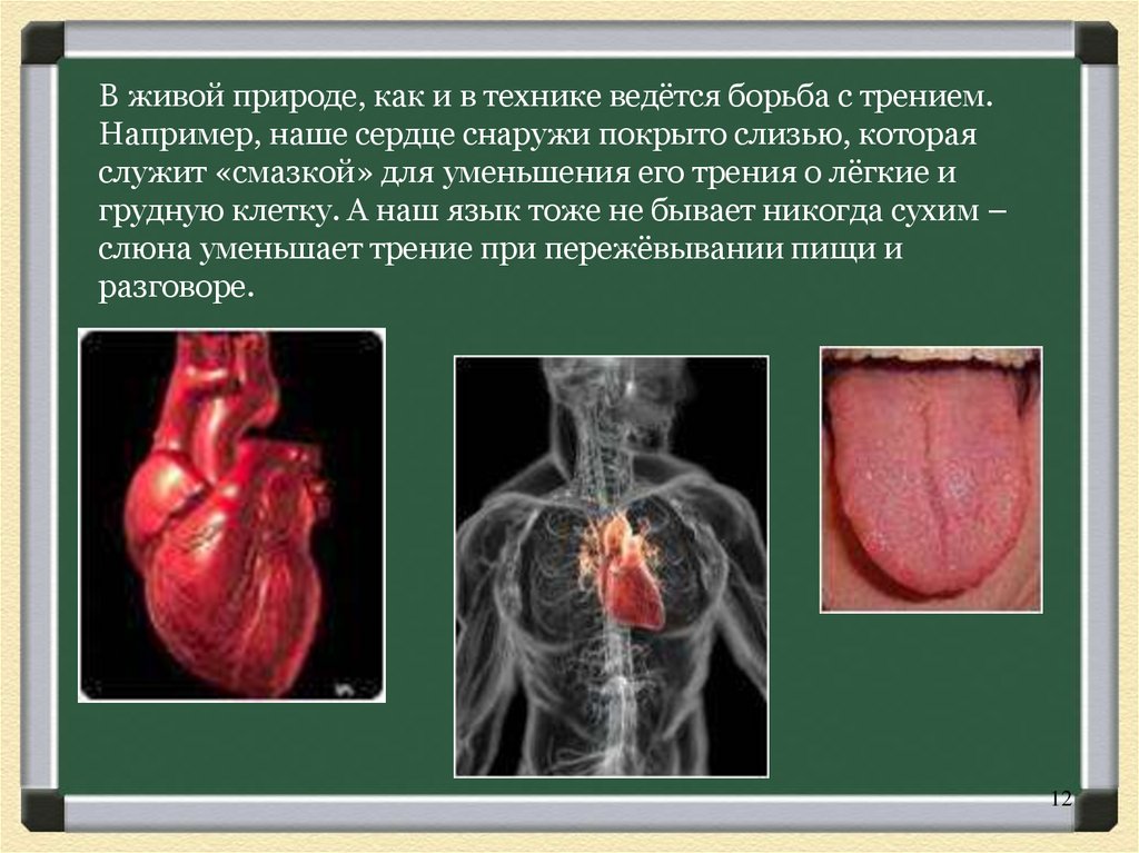 В живой природе, как и в технике ведётся борьба с трением.Например, наше сердце снаружи покрыто слизью, которая