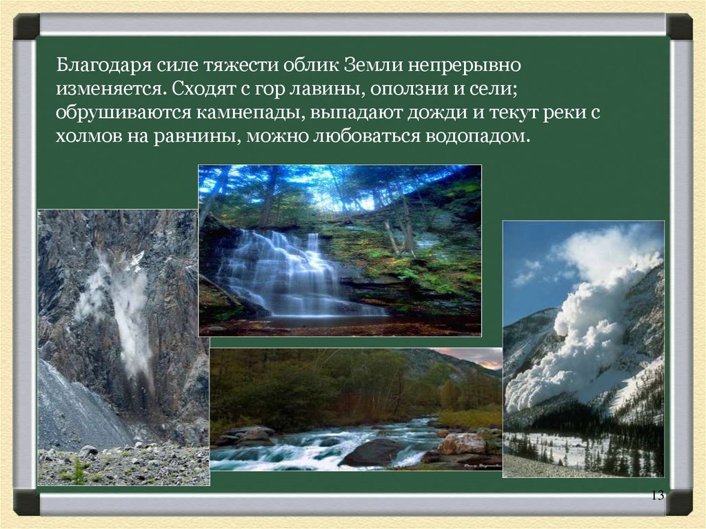 Благодаря силе тяжести облик Земли непрерывноизменяется. Сходят с гор лавины, оползни и сели;