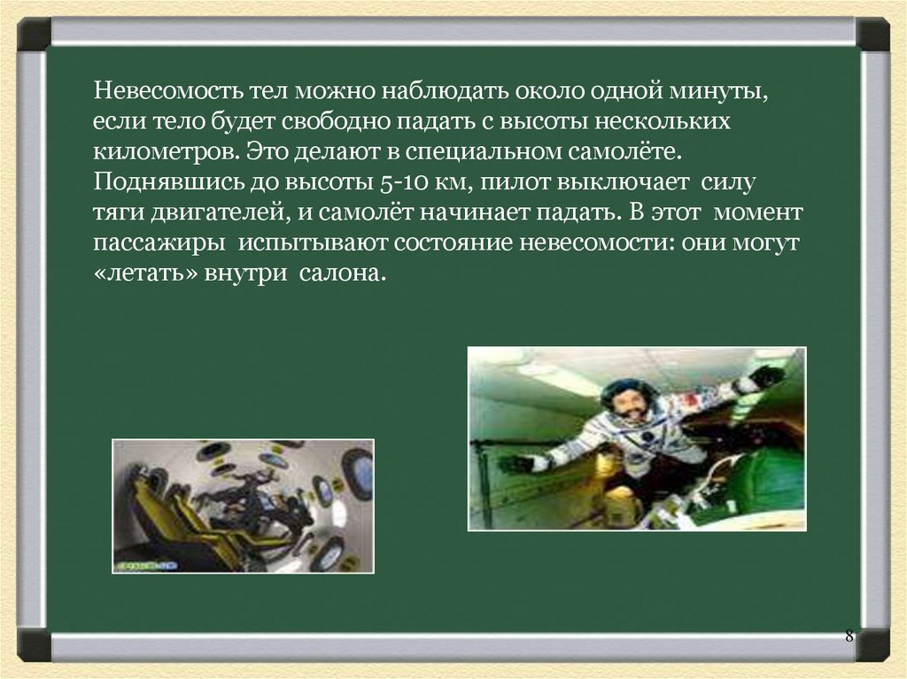 Невесомость тел можно наблюдать около одной минуты,если тело будет свободно падать с высоты нескольких