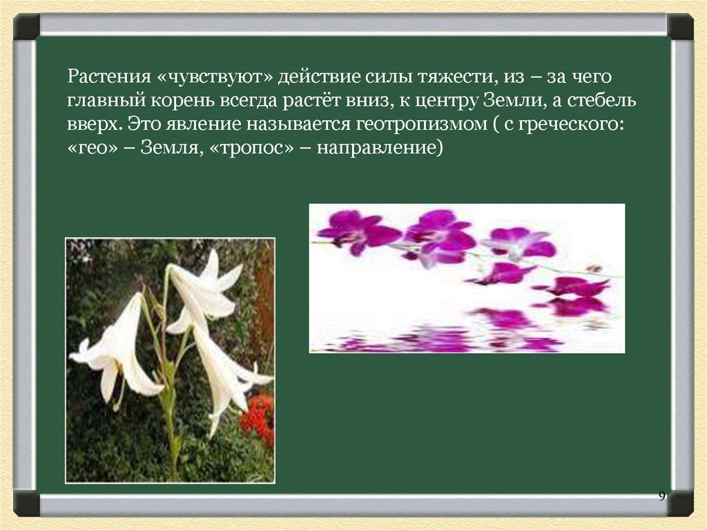Растения «чувствуют» действие силы тяжести, из – за чегоглавный корень всегда растёт вниз, к центру Земли, а стебель