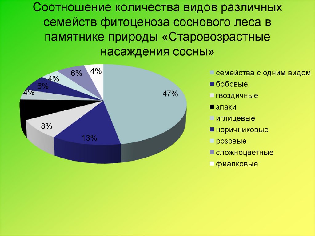 Соотношение количества видов различныхсемейств фитоценоза соснового леса в