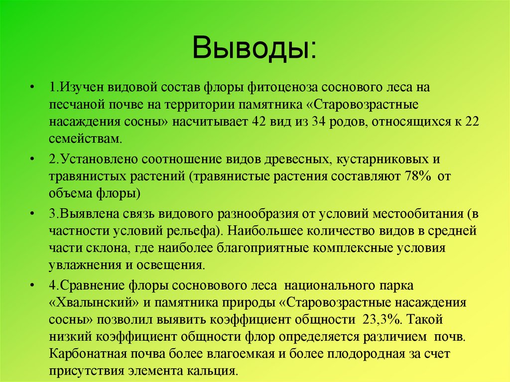 Выводы:• 1.Изучен видовой состав флоры фитоценоза соснового леса на
