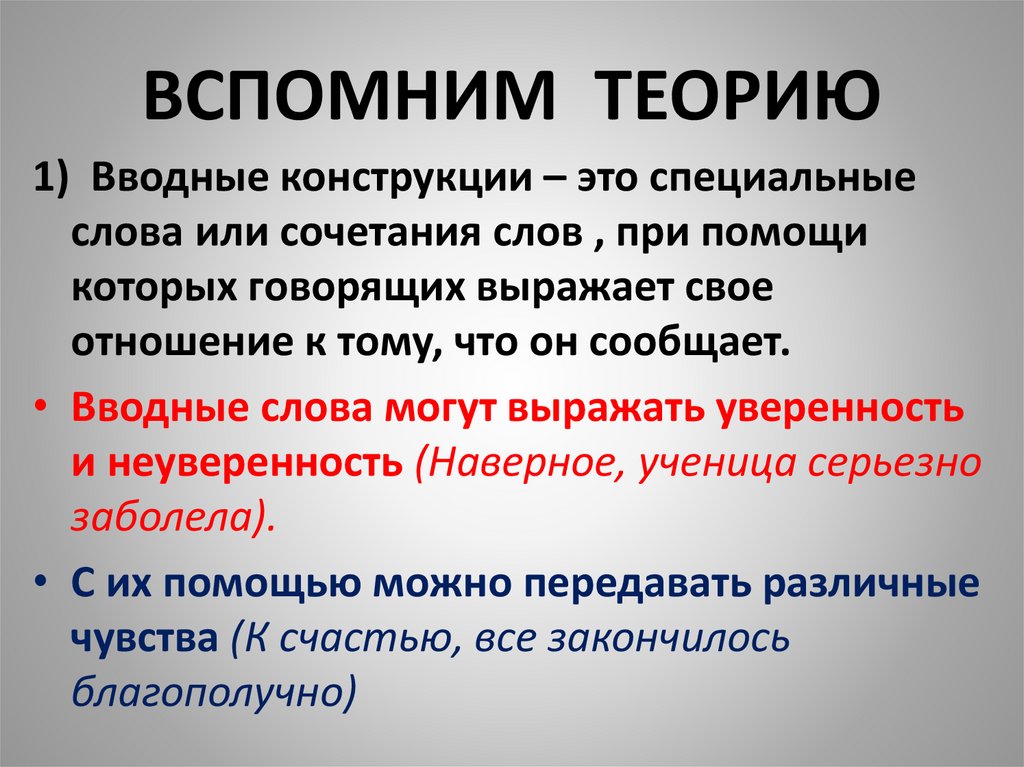 ВСПОМНИМ ТЕОРИЮ1) Вводные конструкции – это специальные