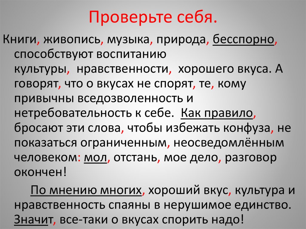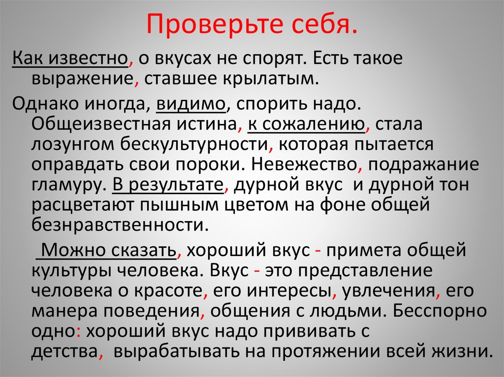 Проверьте себя.Как известно, о вкусах не спорят. Есть такое
