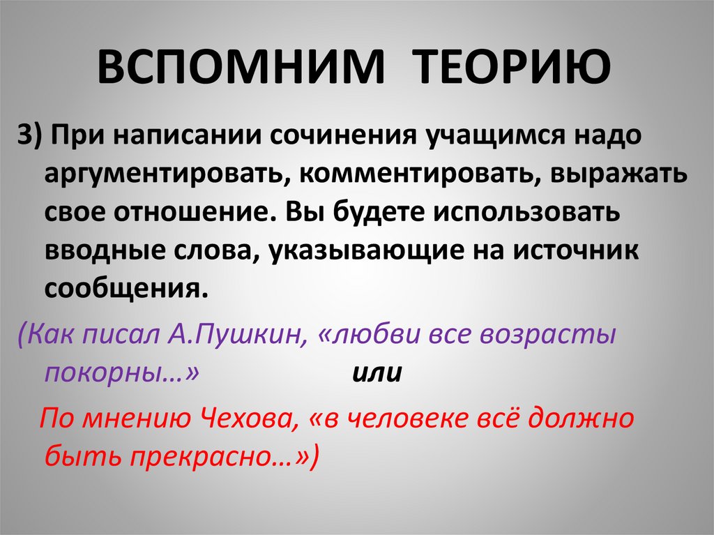 ВСПОМНИМ ТЕОРИЮ3) При написании сочинения учащимся надо