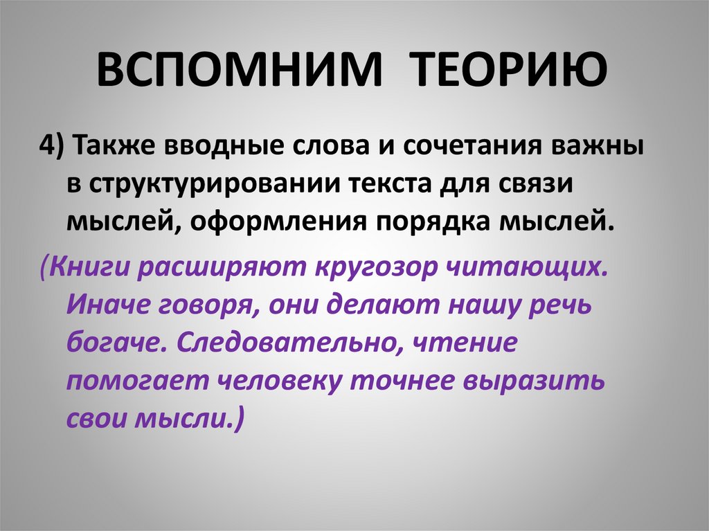 ВСПОМНИМ ТЕОРИЮ4) Также вводные слова и сочетания важны