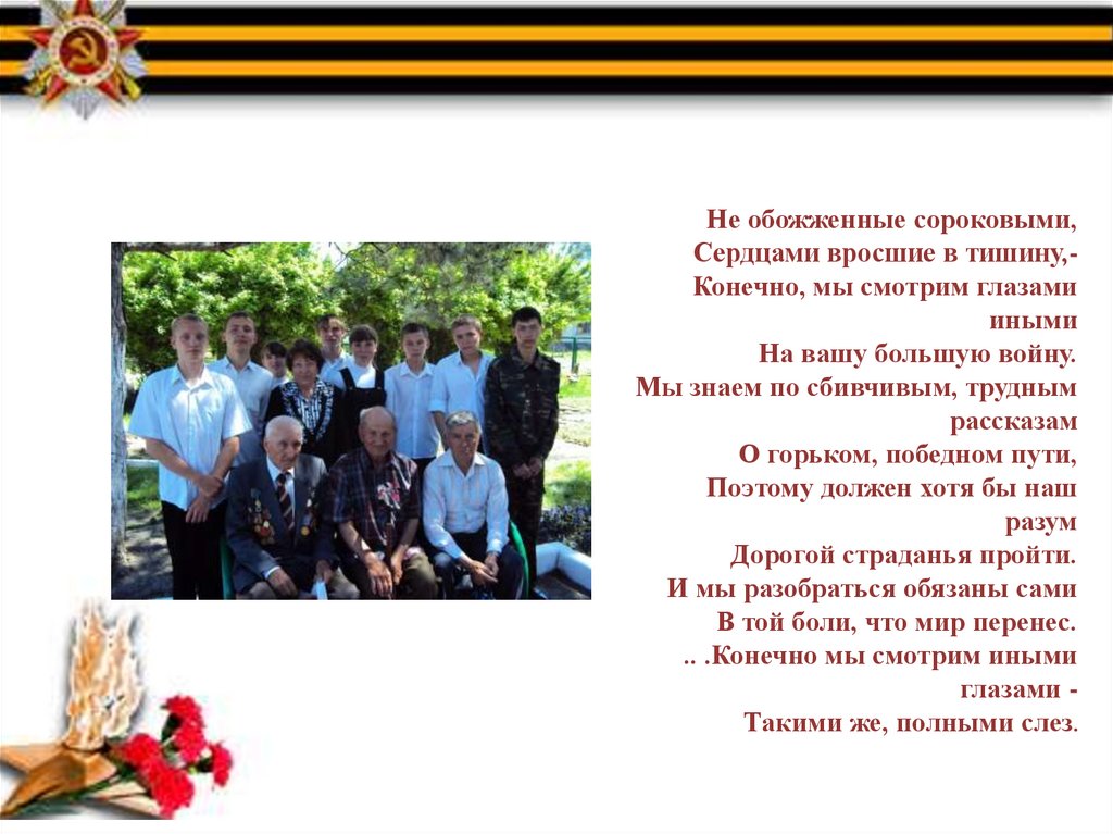 Не обожженные сороковыми,Сердцами вросшие в тишину,Конечно, мы смотрим глазами