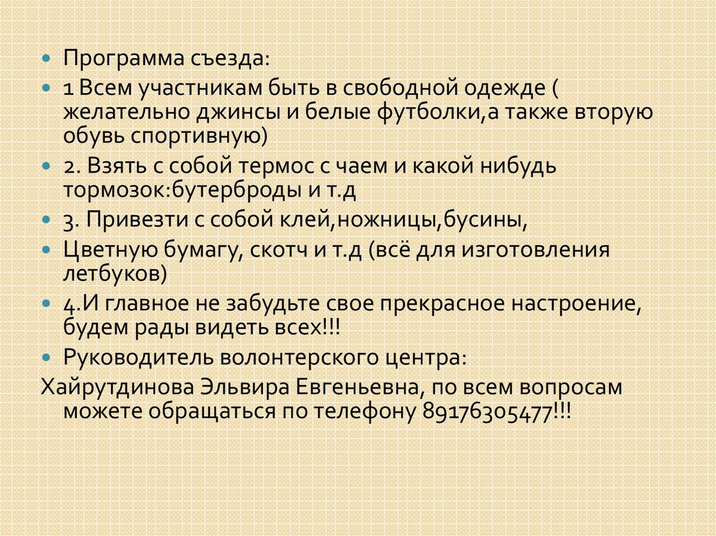Программа съезда:1 Всем участникам быть в свободной одежде (