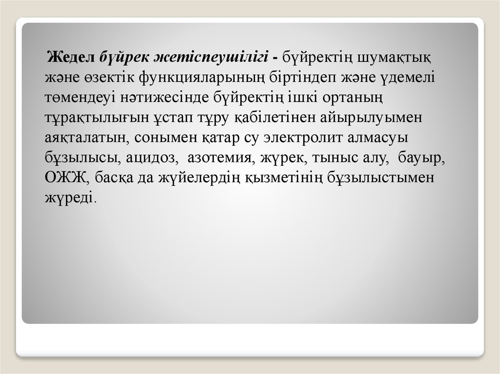 Жедел бүйрек жетіспеушілігі - бүйректің шумақтықжәне өзектік функцияларының біртіндеп және үдемелі