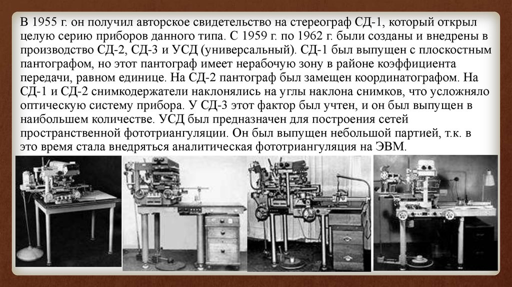 В 1955 г. он получил авторское свидетельство на стереограф СД-1, который открылцелую серию приборов данного типа. С 1959 г. по 1962 г. были созданы и внедрены в