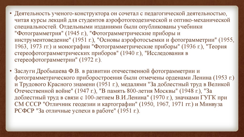 • Деятельность ученого-конструктора он сочетал с педагогической деятельностью,читая курсы лекций для студентов аэрофотогеодезической и оптико-механической