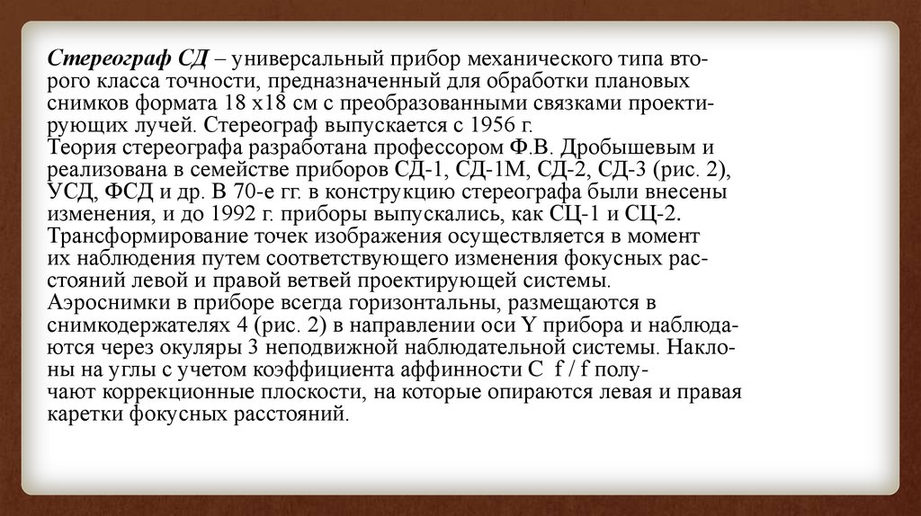 Стереограф СД – универсальный прибор механического типа второго класса точности, предназначенный для обработки плановыхснимков формата 18 х18 см с преобразованными связками проектирующих лучей. Стереограф выпускается с 1956 г.