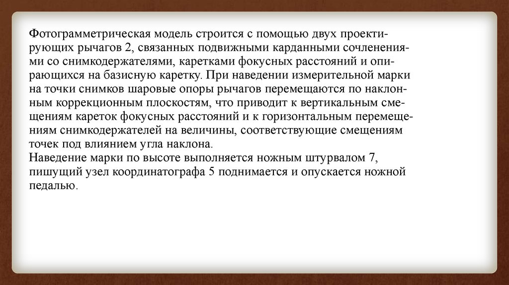 Фотограмметрическая модель строится с помощью двух проектирующих рычагов 2, связанных подвижными карданными сочленениями со снимкодержателями, каретками фокусных расстояний и опирающихся на базисную каретку. При наведении измерительной маркина точки снимков шаровые опоры рычагов перемещаются по наклонным коррекционным плоскостям, что приводит к вертикальным смещениям кареток фокусных расстояний и к горизонтальным перемещениям снимкодержателей на величины, соответствующие смещениям