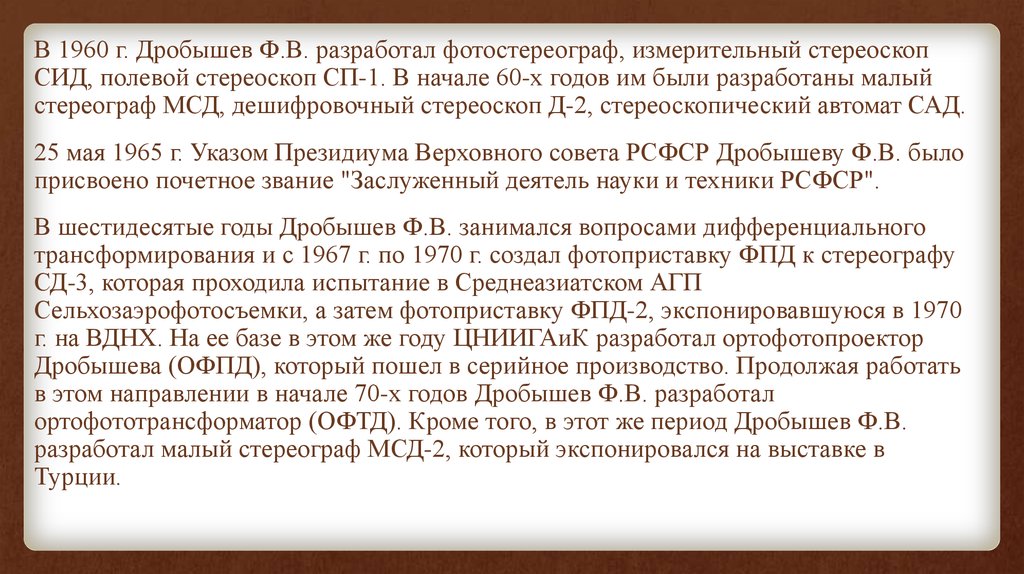 В 1960 г. Дробышев Ф.В. разработал фотостереограф, измерительный стереоскопСИД, полевой стереоскоп СП-1. В начале 60-х годов им были разработаны малый