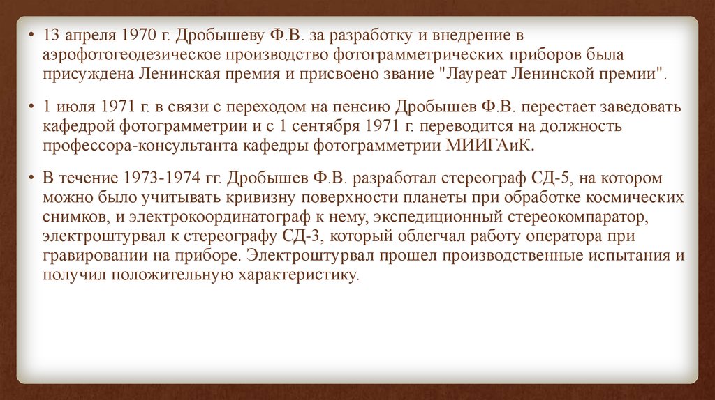 • Заслуги Дробышева Ф.В. в развитии отечественной фотограмметрии и