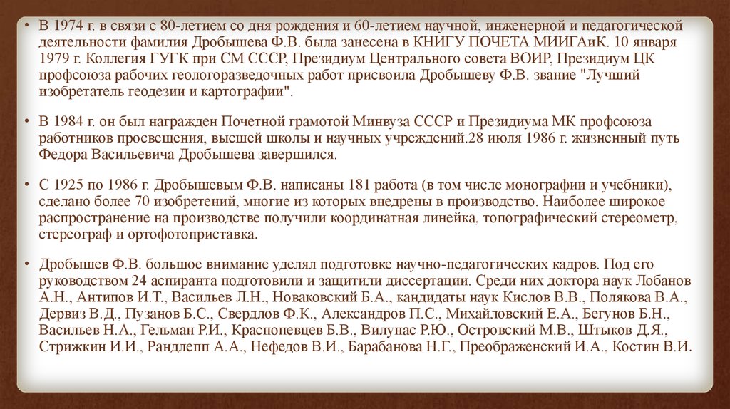 • В 1974 г. в связи с 80-летием со дня рождения и 60-летием научной, инженерной и педагогическойдеятельности фамилия Дробышева Ф.В. была занесена в КНИГУ ПОЧЕТА МИИГАиК. 10 января
