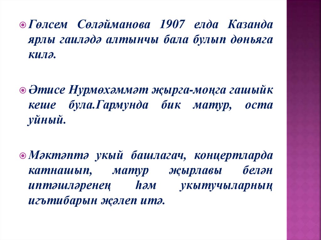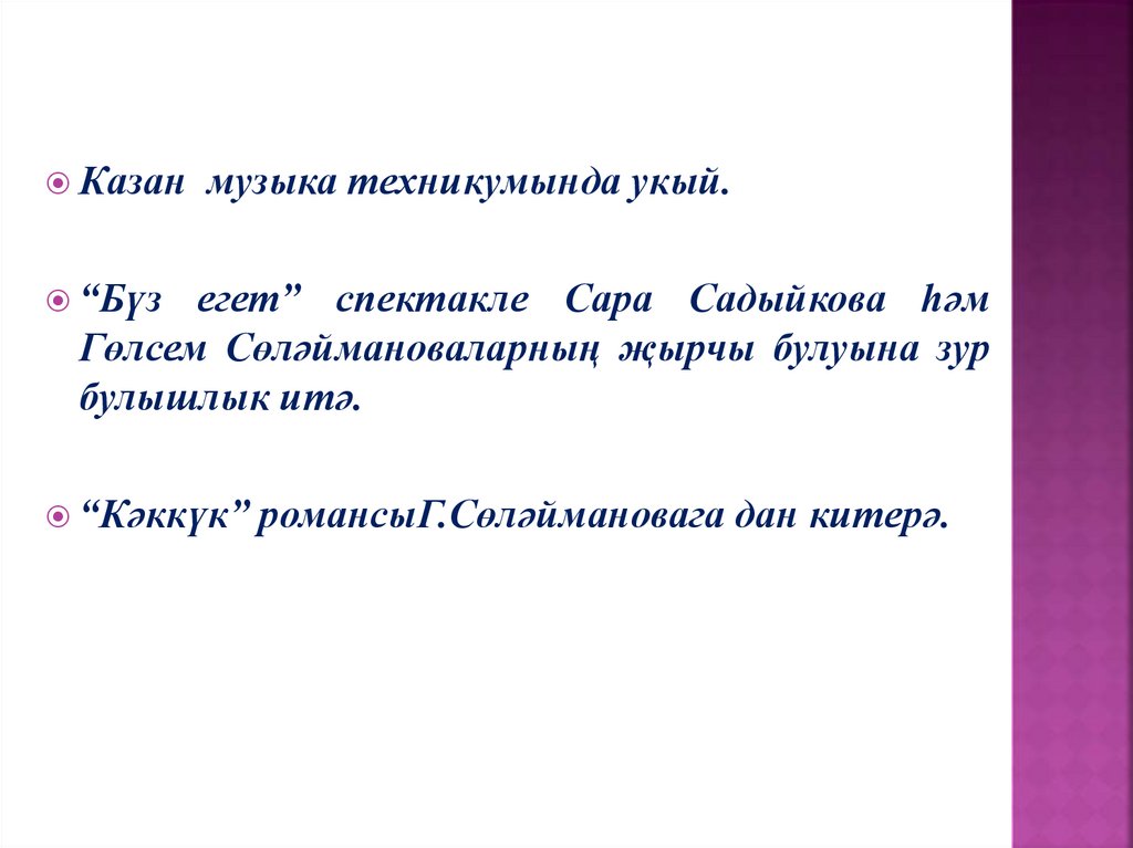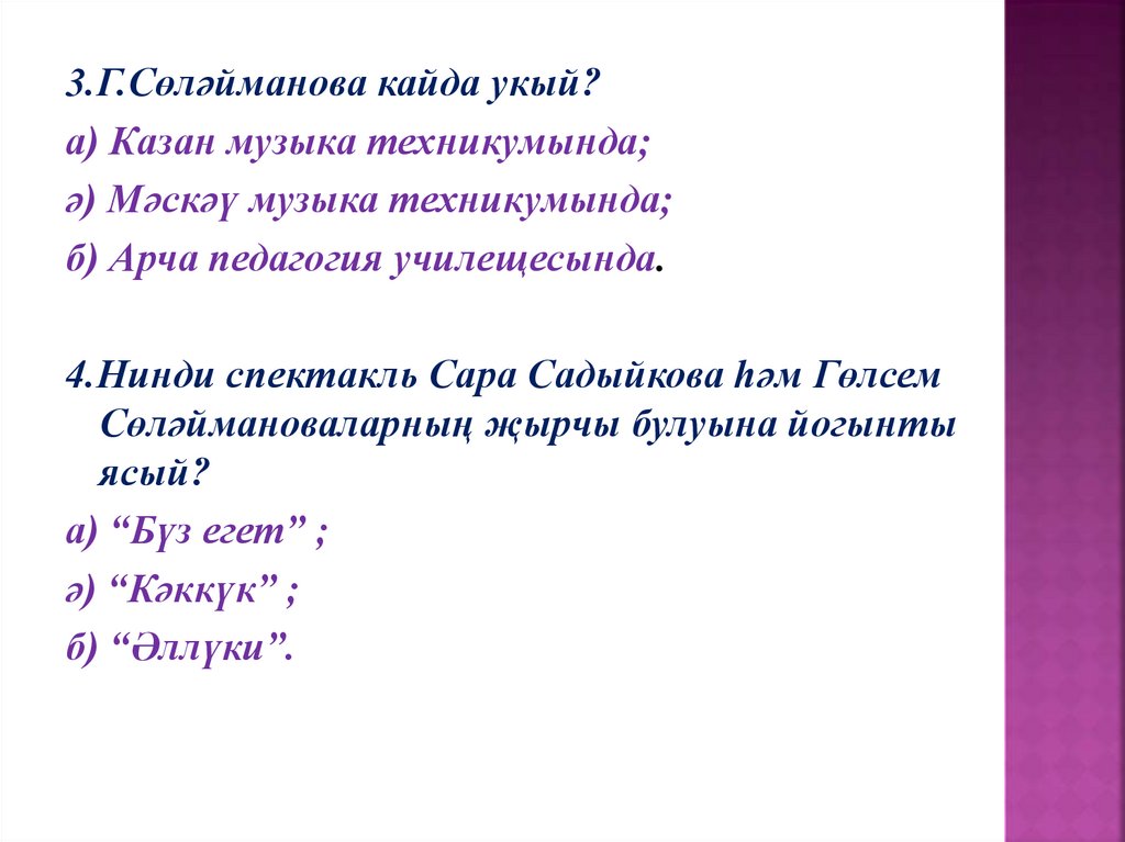 3.Г.Сөләйманова кайда укый?а) Казан музыка техникумында;