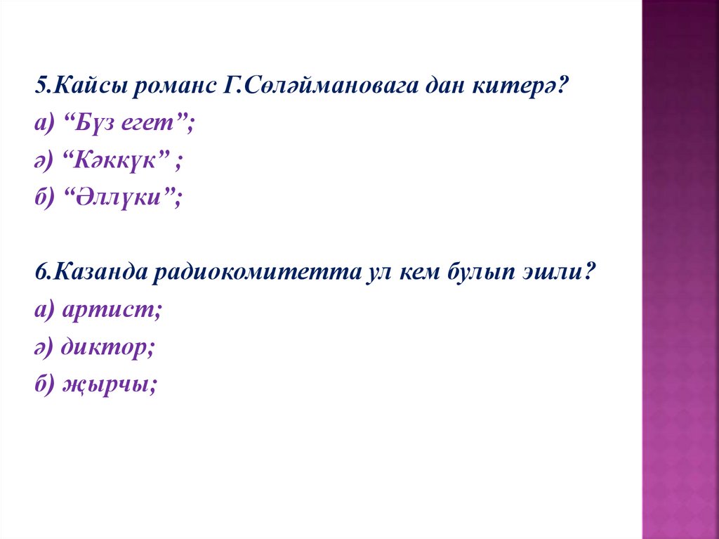 5.Кайсы романс Г.Сөләймановага дан китерә?а) “Бүз егет”;