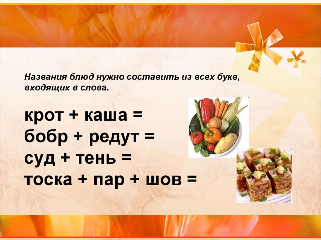 Названия блюд нужно составить из всех букв,входящих в слова.