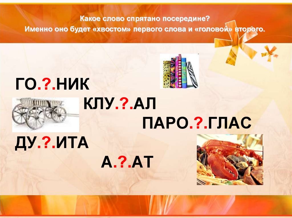 Какое слово спрятано посередине?Именно оно будет «хвостом» первого слова и «головой» второго.