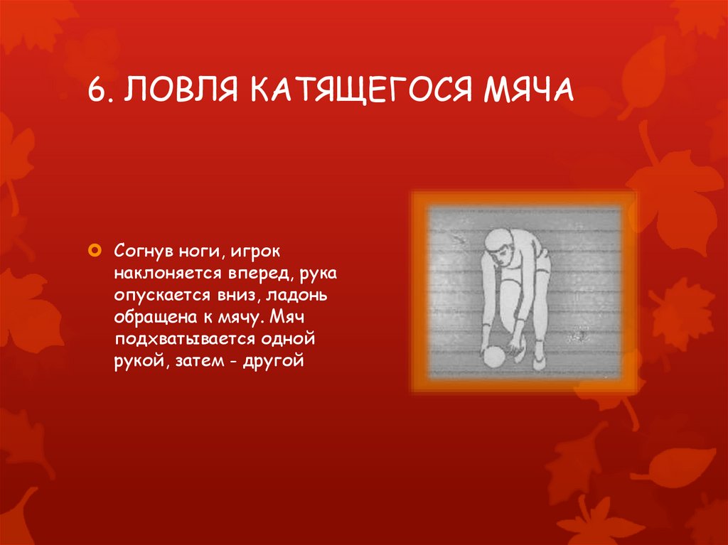 6. ЛОВЛЯ КАТЯЩЕГОСЯ МЯЧАСогнув ноги, игрок