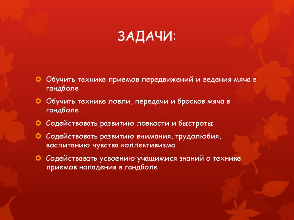 ЗАДАЧИ:Обучить технике приемов передвижений и ведения мяча в