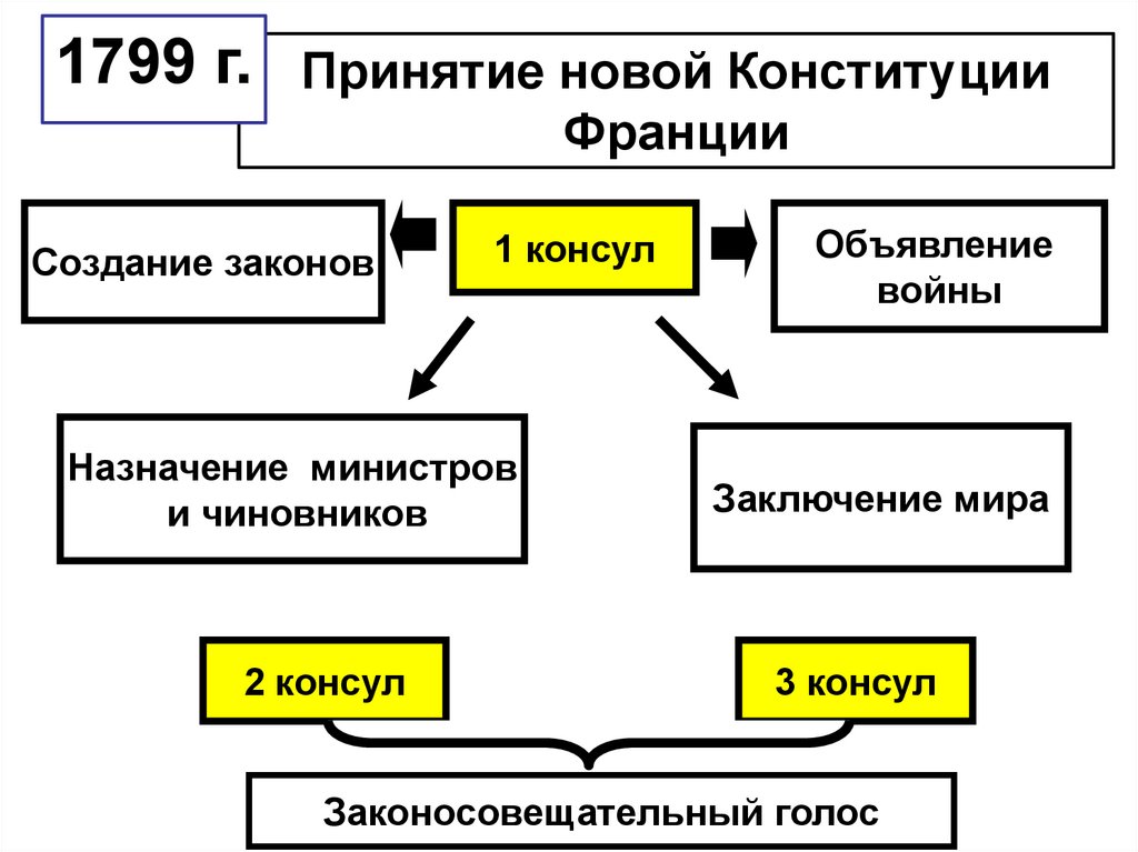 Консульство – Период в истории Франциис 1799 г. по 1804 г., когда власть
