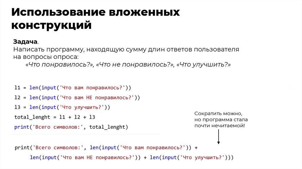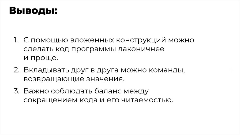 ➔ умеренное использование вложенных конструкций;
