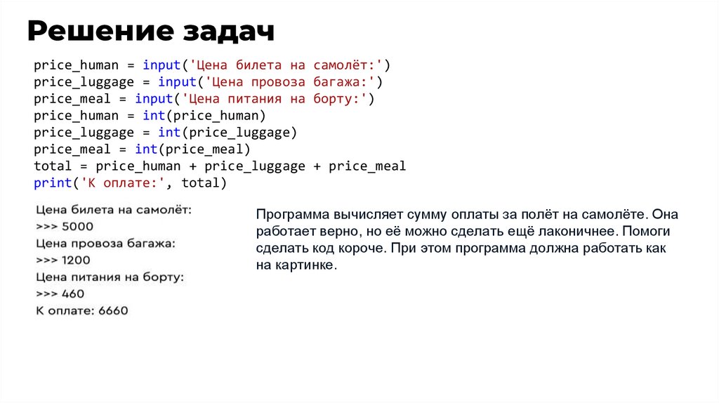 Решение задачprice_human = input('Цена билета на самолёт:')
