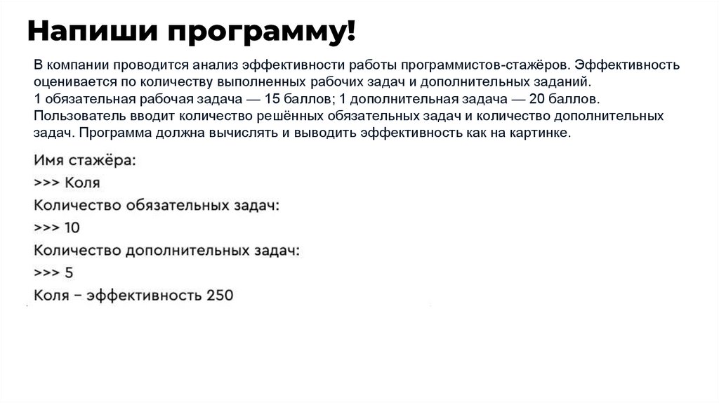 Напиши программу!В компании проводится анализ эффективности работы программистов-стажёров. Эффективность