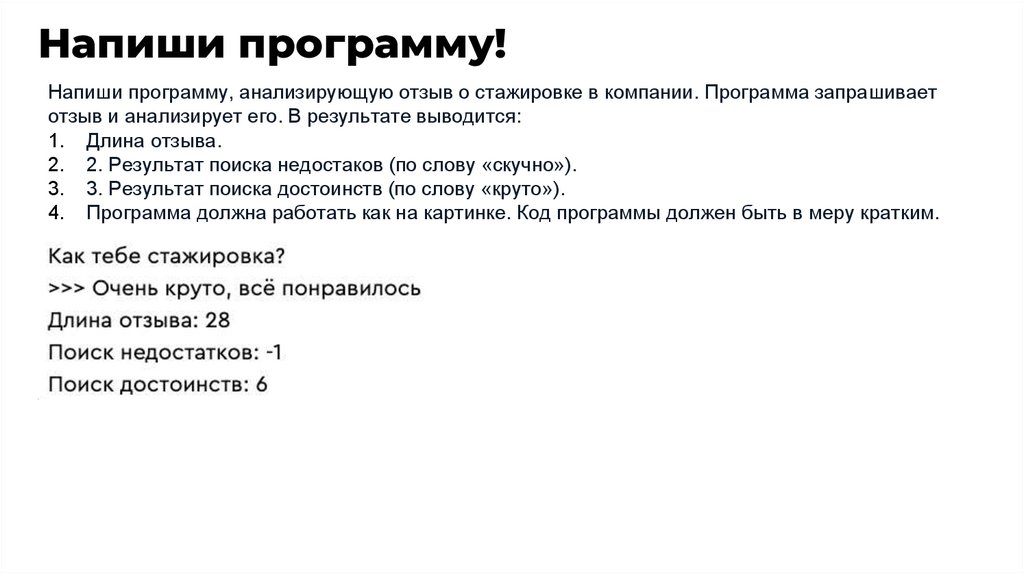 Напиши программу!Напиши программу, анализирующую отзыв о стажировке в компании. Программа запрашивает