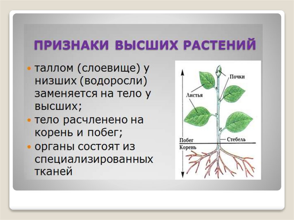 Имеют корневую часть (искл. мхи – ризоиды) и вегетативную