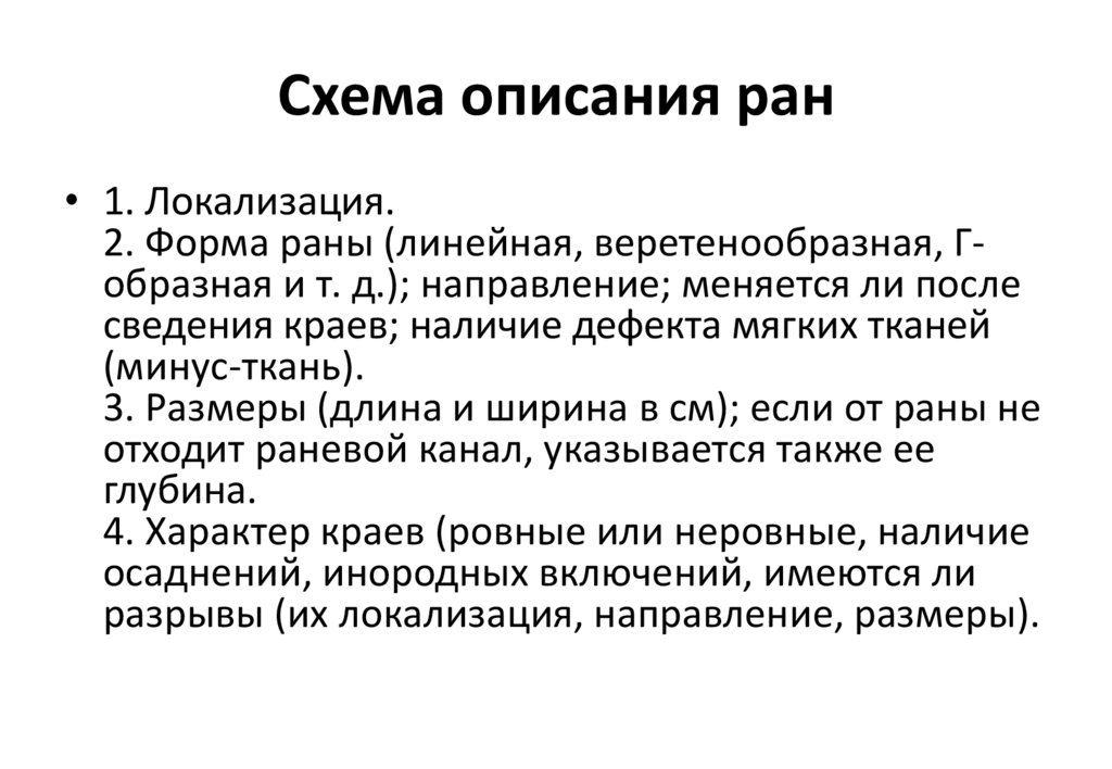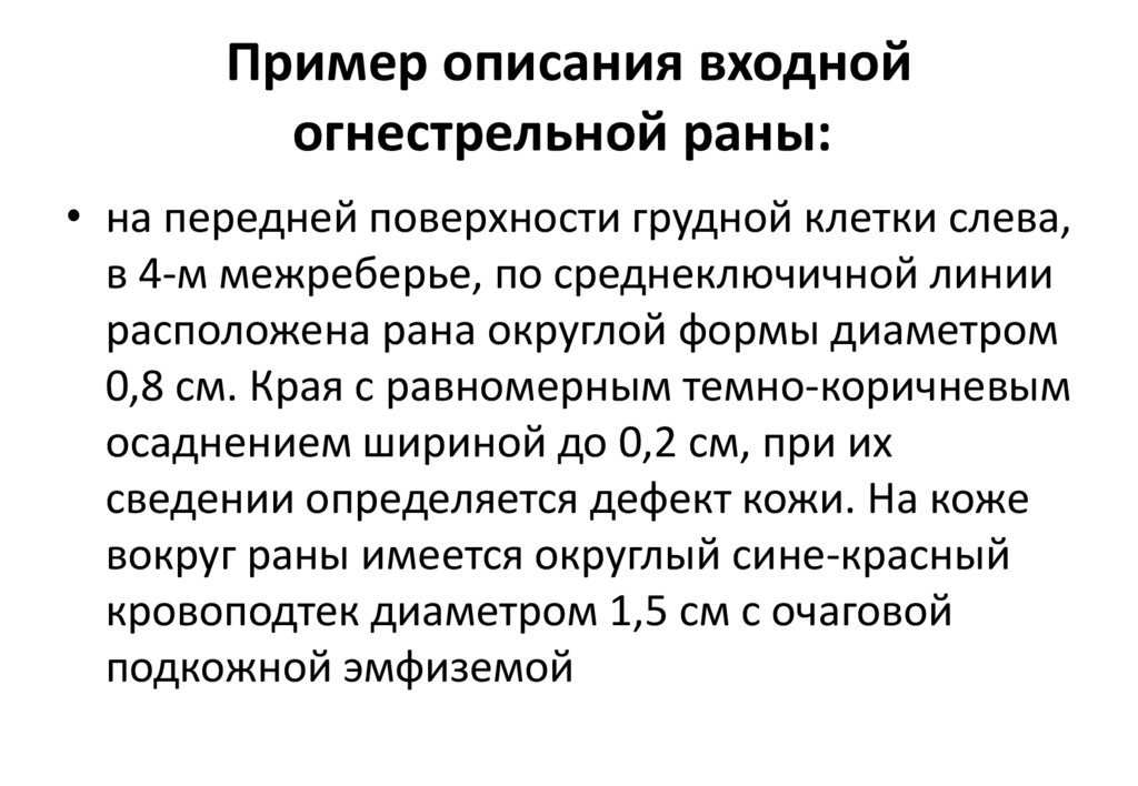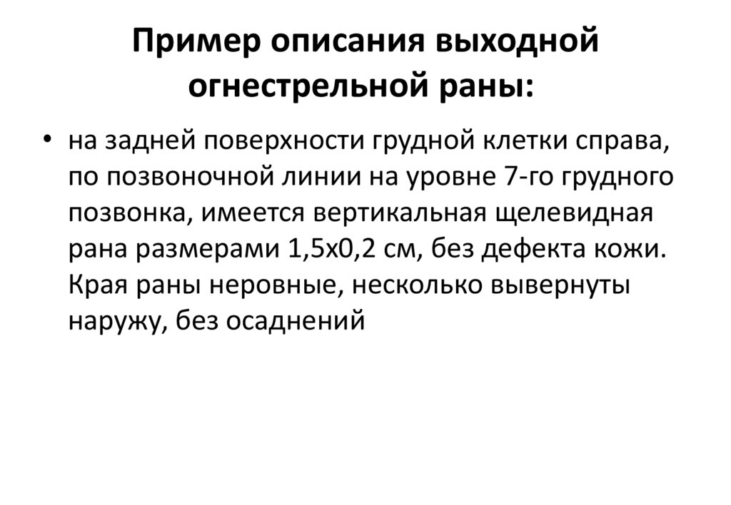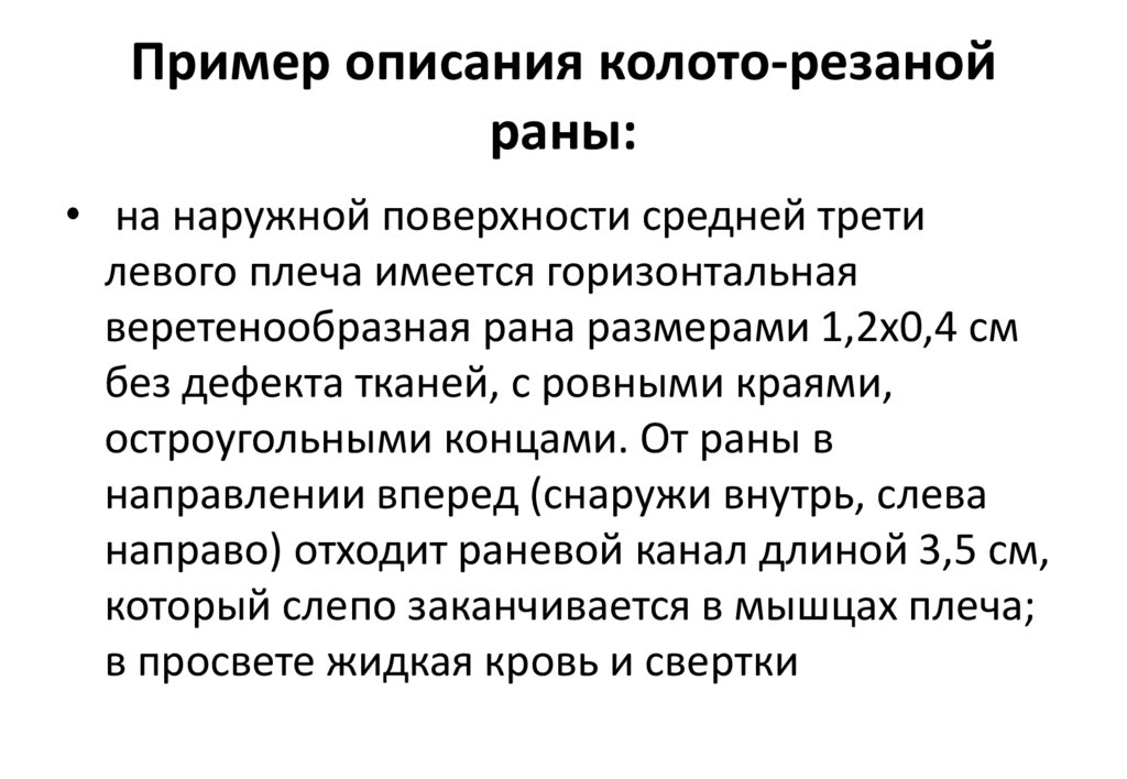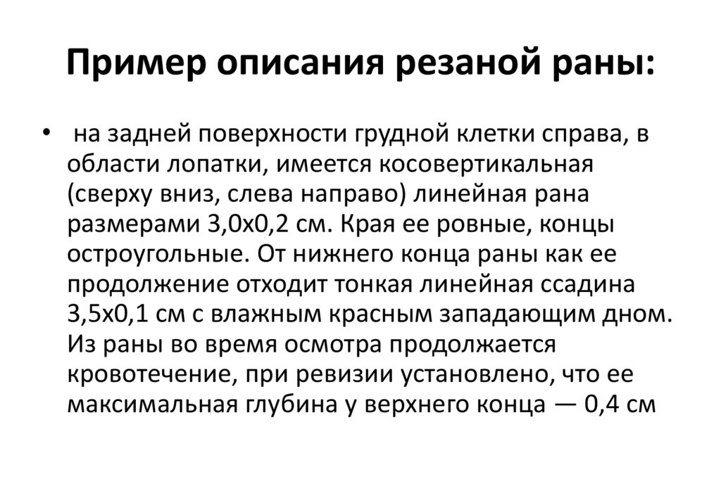 Пример описания резаной раны:• на задней поверхности грудной клетки справа, в