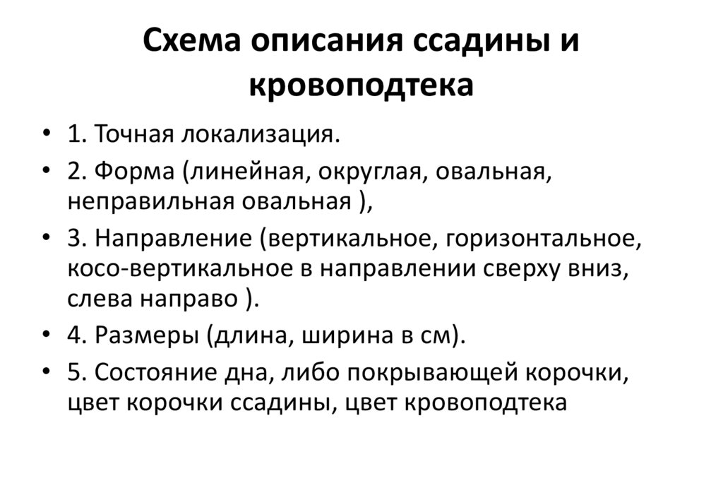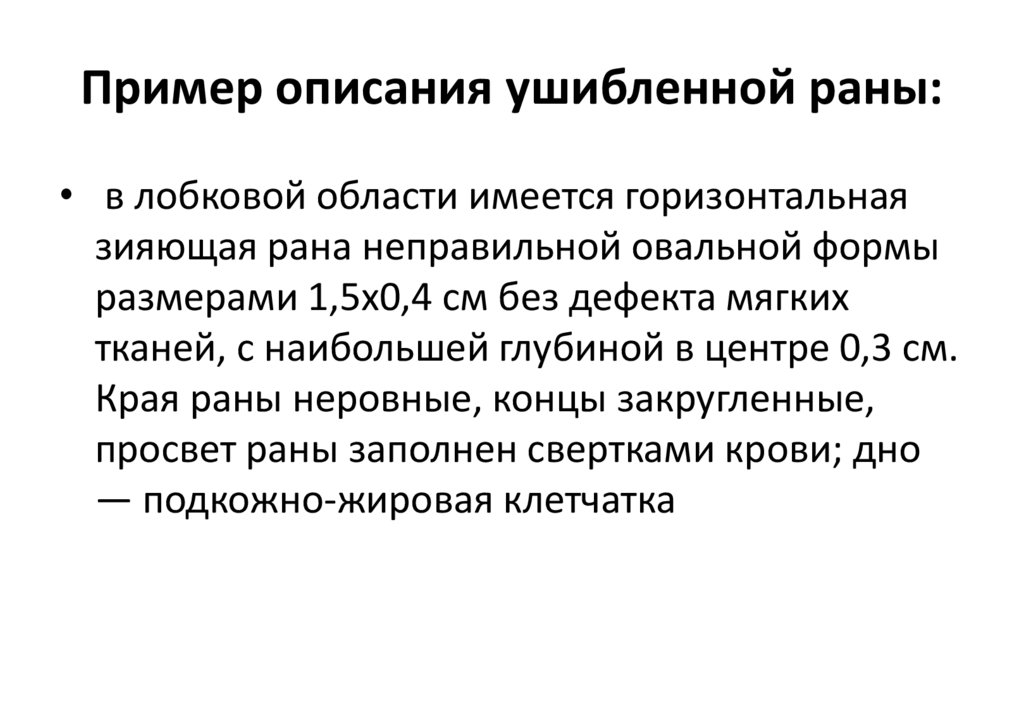 Пример описания ушибленной раны:• в лобковой области имеется горизонтальная