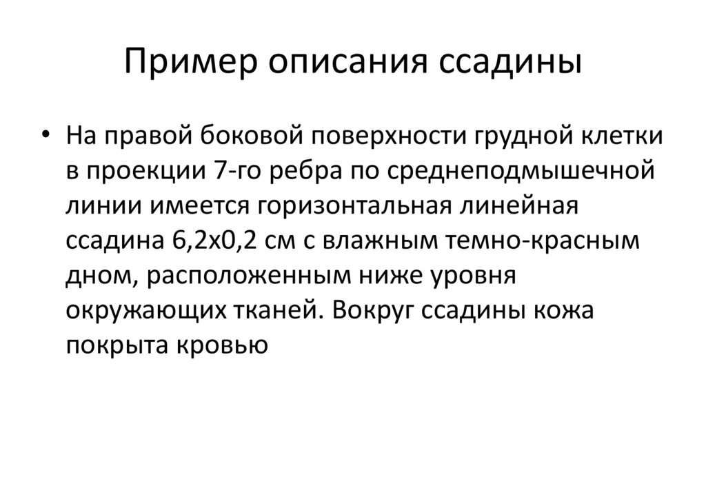 Пример описания ссадины• На правой боковой поверхности грудной клетки
