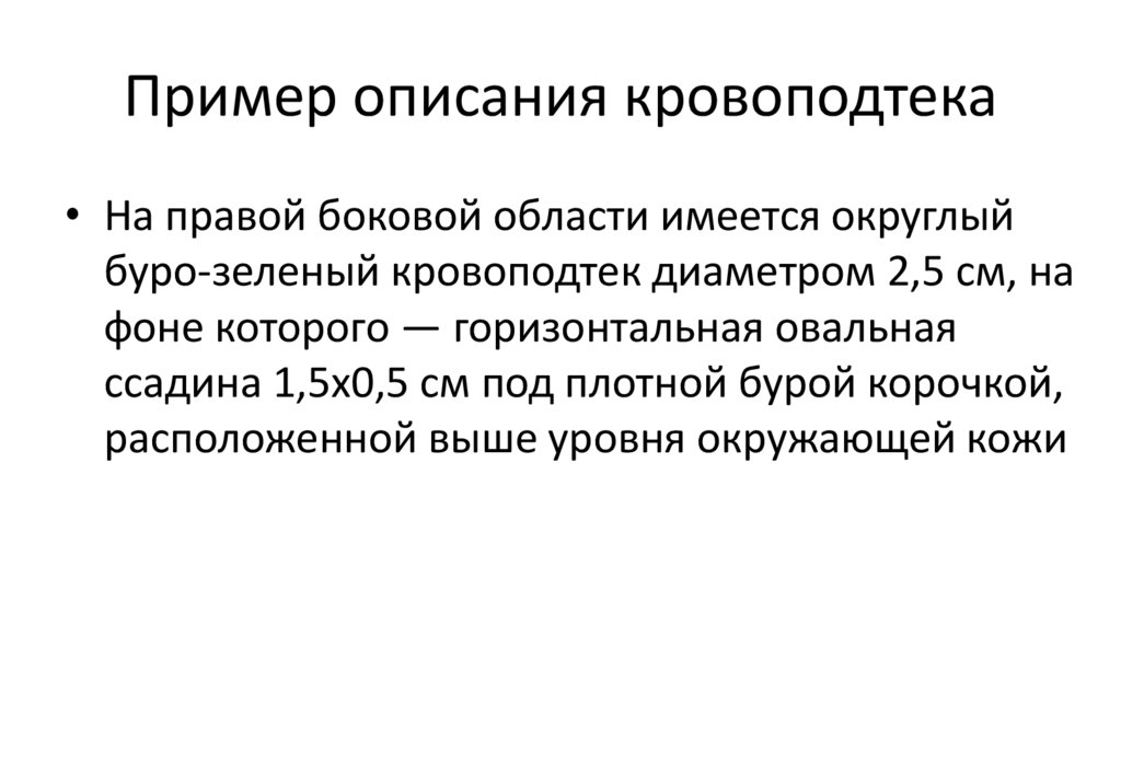 Пример описания кровоподтека• На правой боковой области имеется округлый