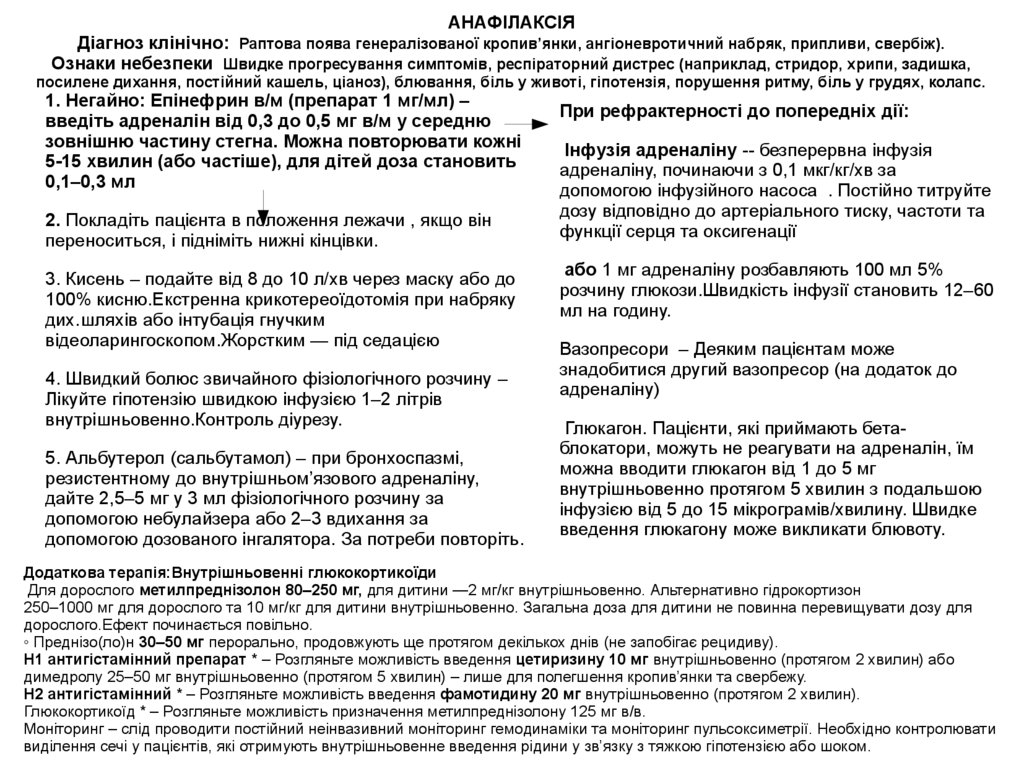 1. Негайно: Епінефрин в/м (препарат 1 мг/мл) –