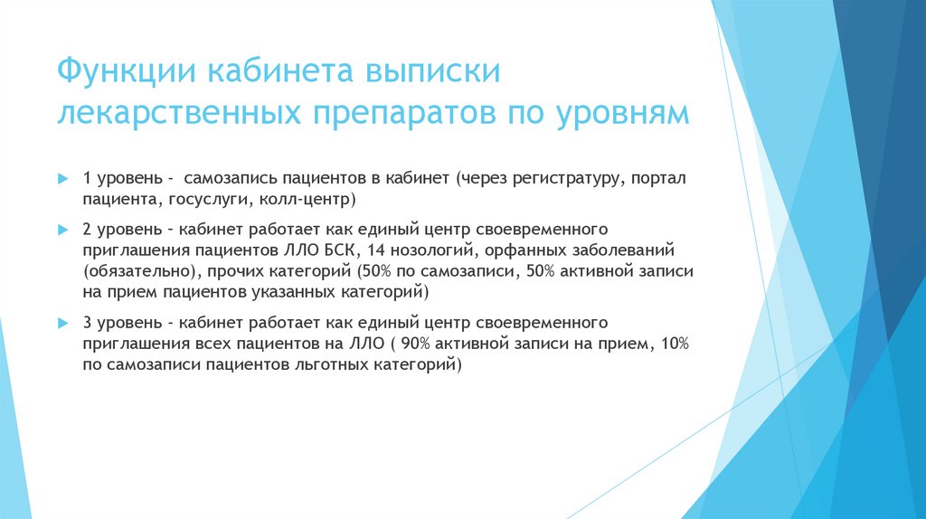 Функции кабинета выпискилекарственных препаратов по уровням