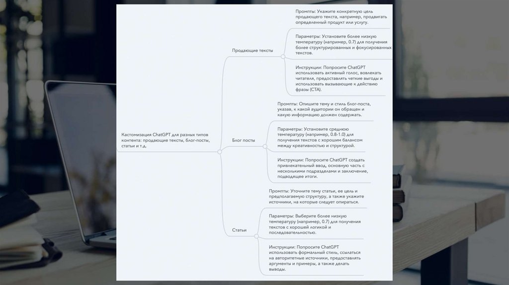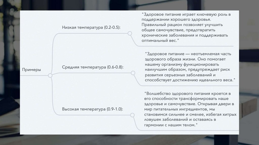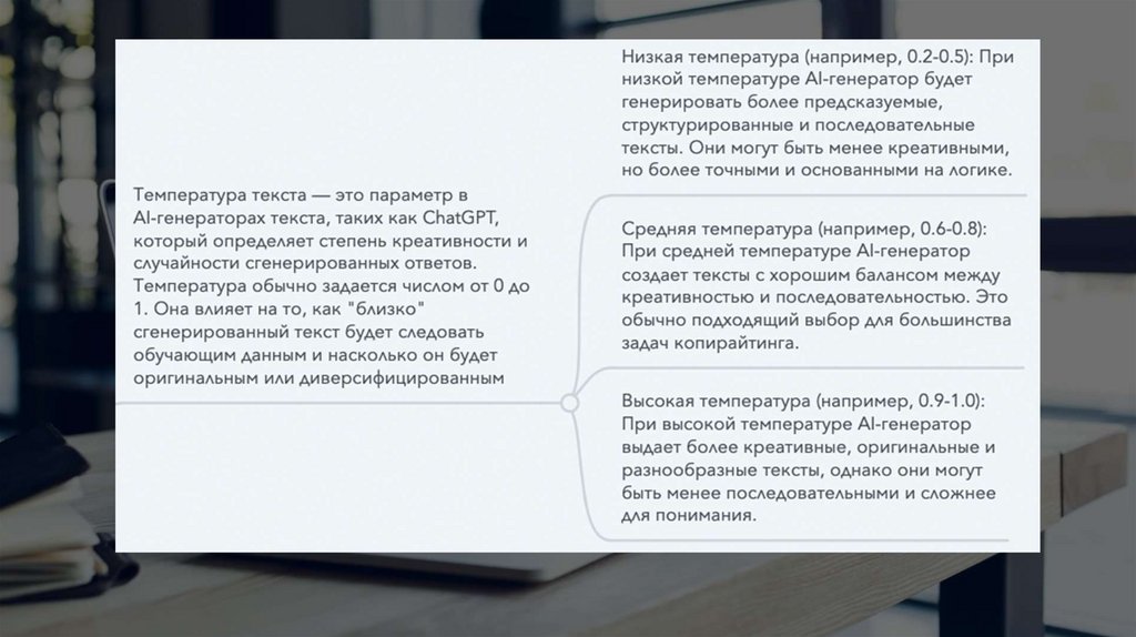 Текст. ChatGPT. Выбор и настройка параметров: длина текста, стиль, температура